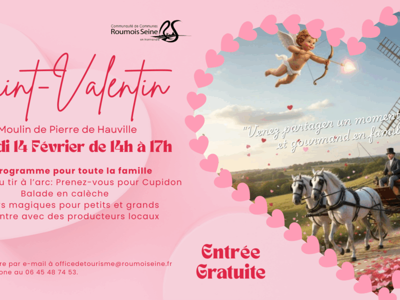 Envie d’un moment magique, gourmand et plein d’amour ? Rendez-vous samedi 14 février de 14h à 17h au Moulin de Pierre de Hauville pour une Saint-Valentin à partager en famille Au programme : Initiation au tir à l’arc [...] Saint-Valentin au Moulin de Pierre de Hauville